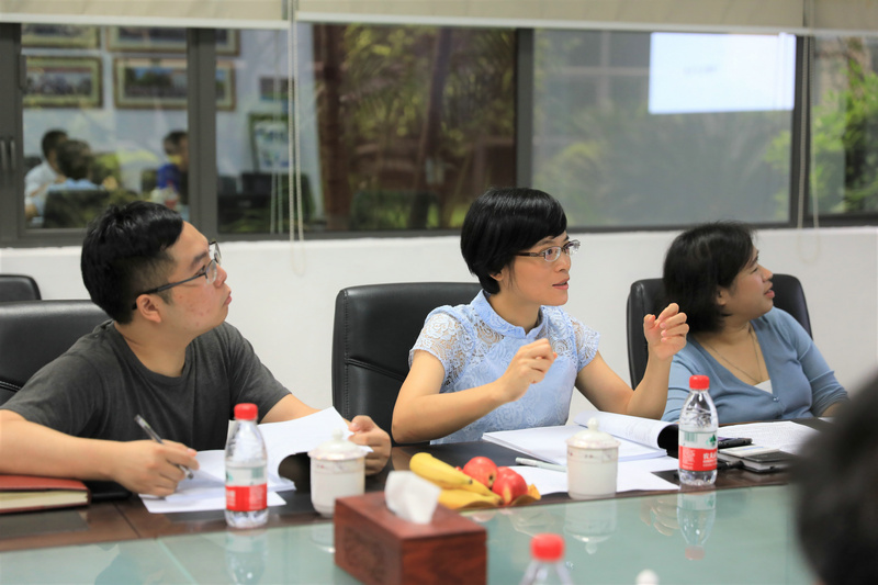 ▲松山湖科創(chuàng)局領(lǐng)導(dǎo)討論項(xiàng)目市場應(yīng)用情況